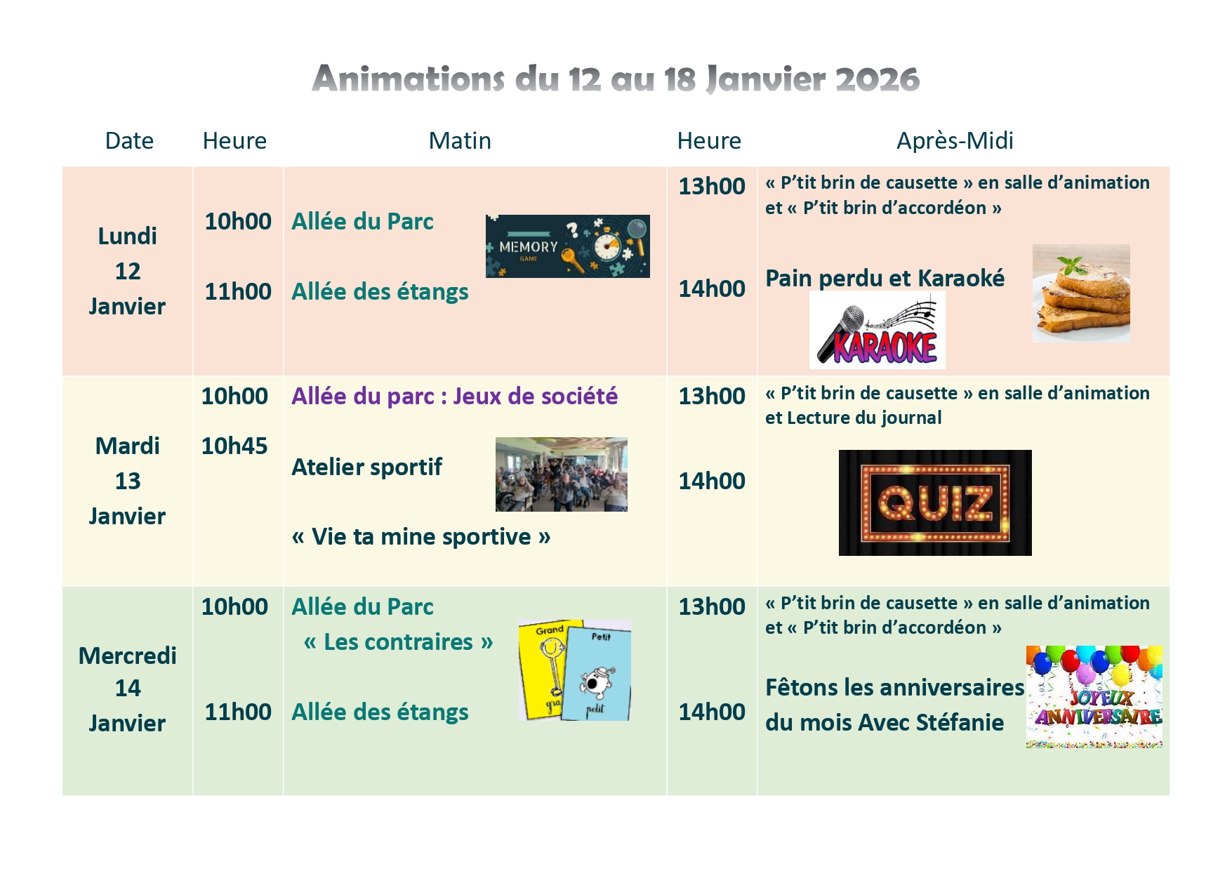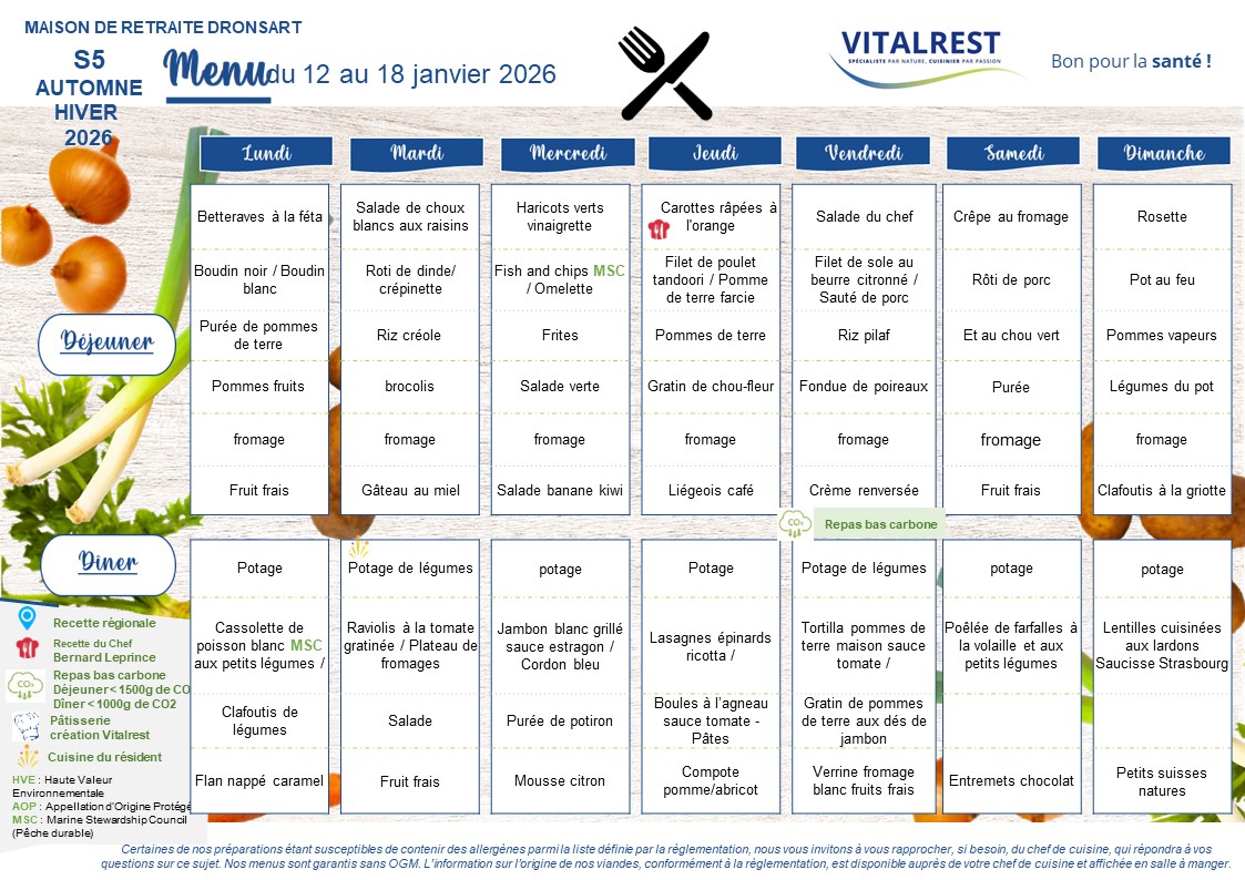 Menu/ Animation du 12 Janvier au 18 Janvier